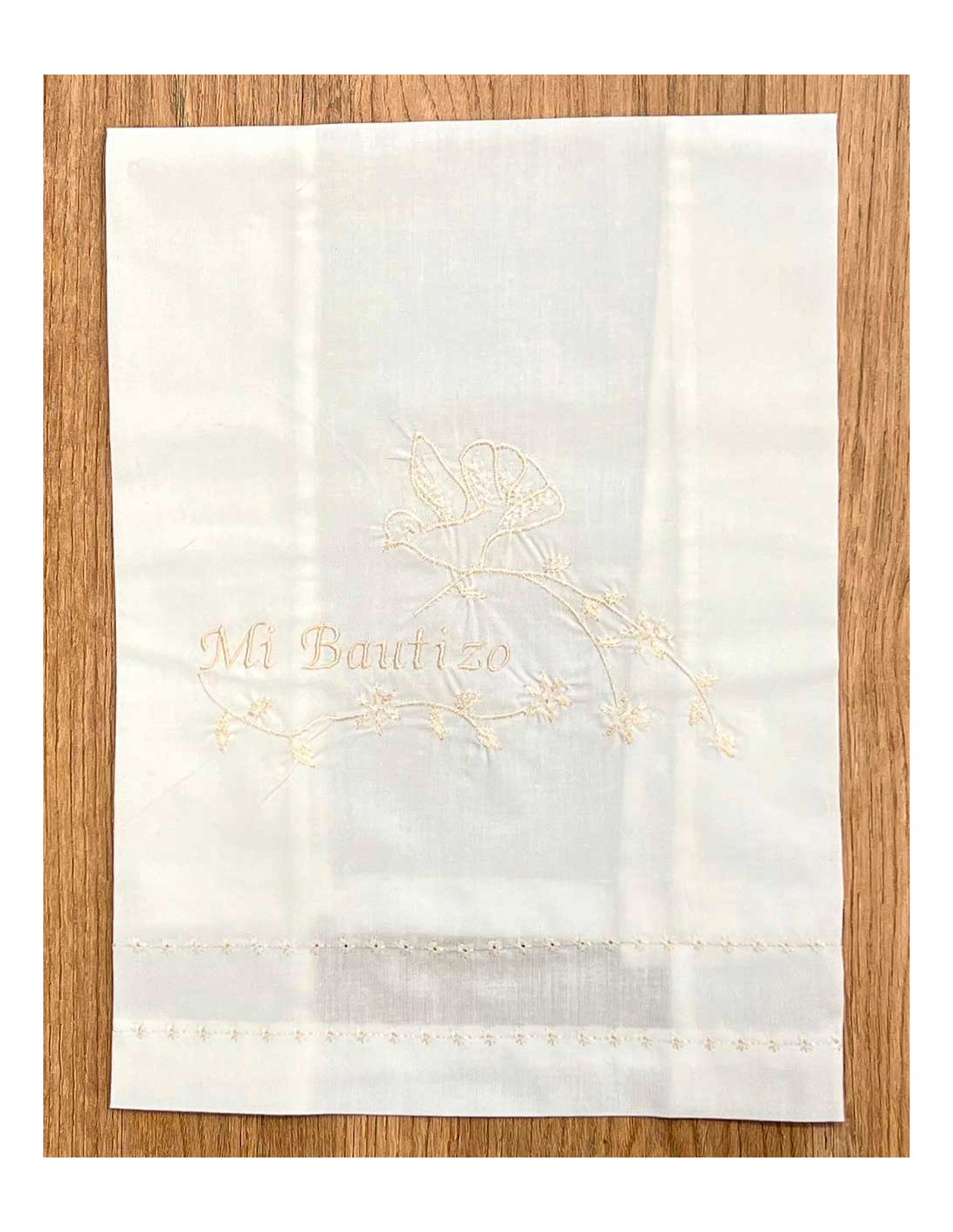 <p>Con la frase "Mi Bautizo" bordada de forma elegante, refleja la pureza y la ternura del día más importante.</p>