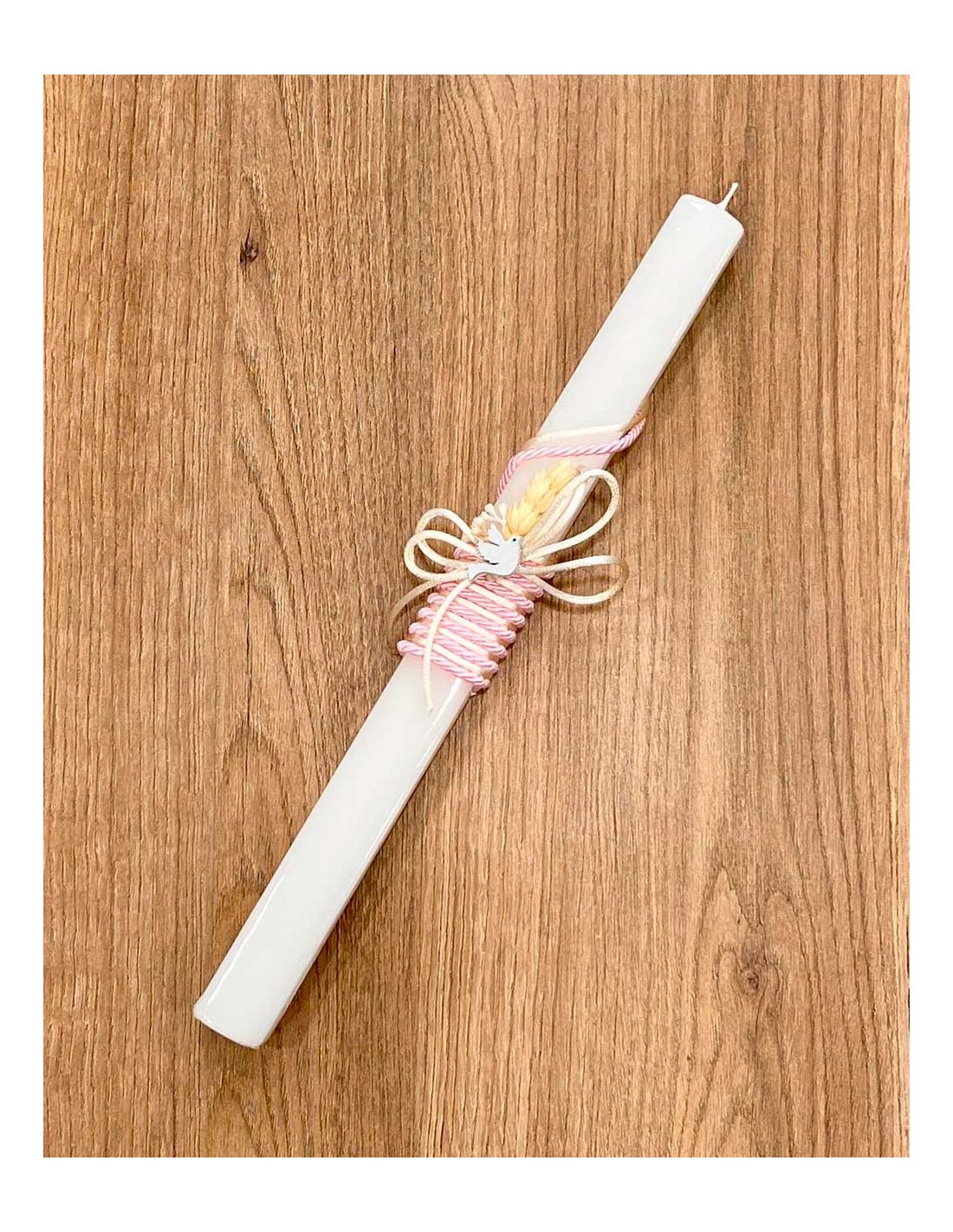 Esta vela de bautizo destaca por su diseño sobrio y natural, ideal para quienes buscan una opción elegante con un toque rústico.