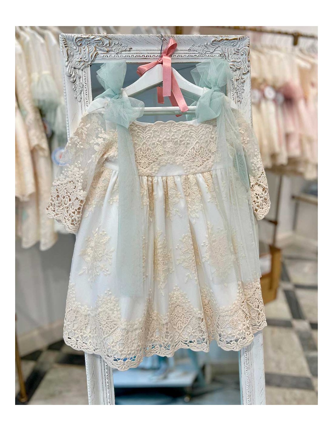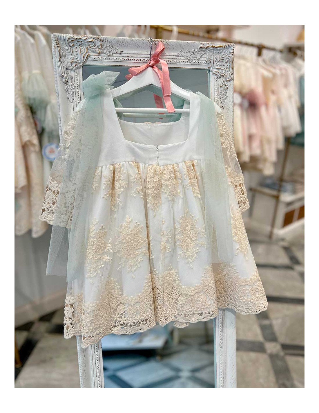 <p>Además, la prenda está adornada con una delicada tela de tul en los hombros en color verde agua, que aporta un aire etéreo y encantador. Este vestido es perfecto para eventos formales o celebraciones como bautizos o primeras comuniones.</p>