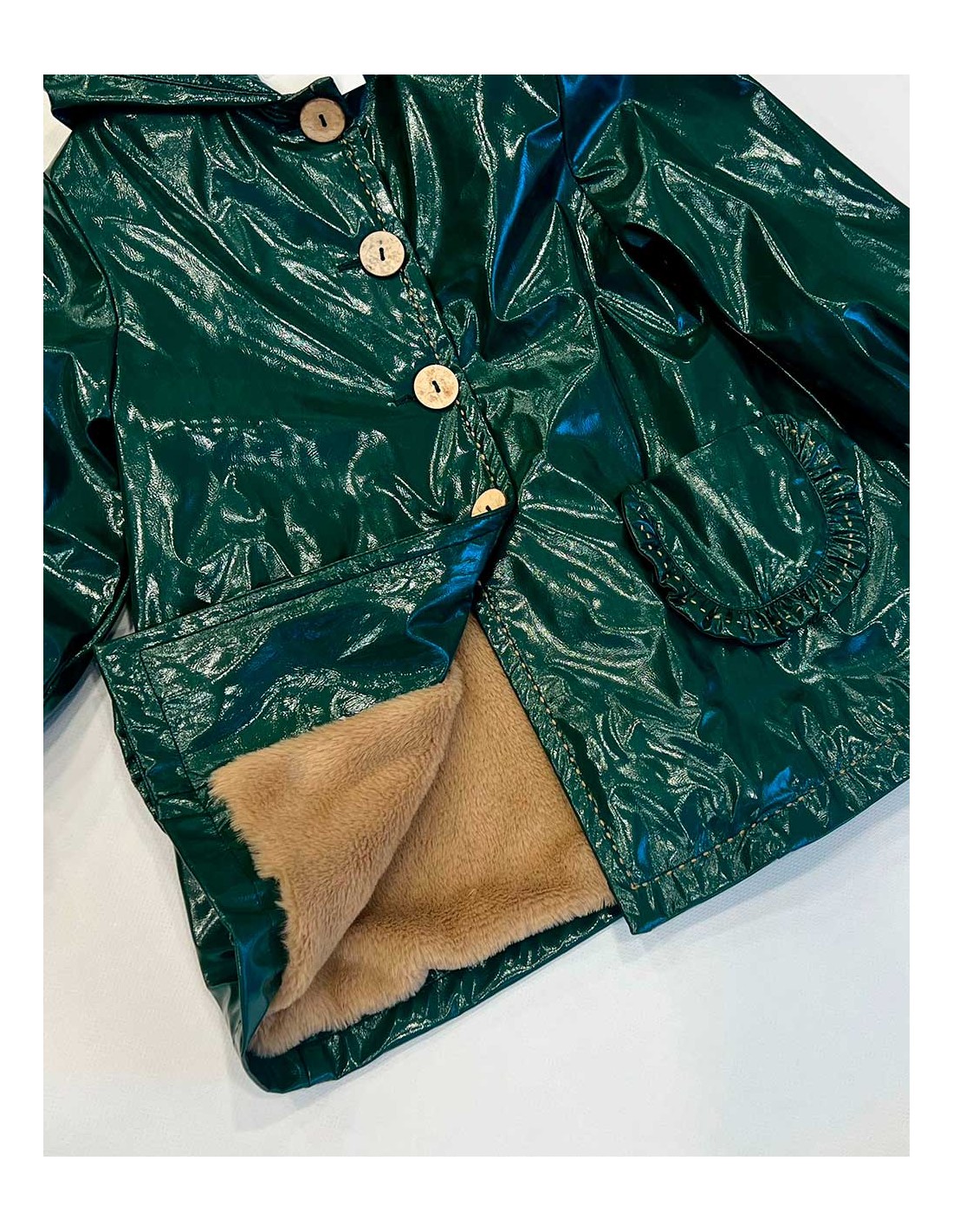 Este elegante abrigo de niña en charol rosa palo combina diseño y calidez para los días más fríos.