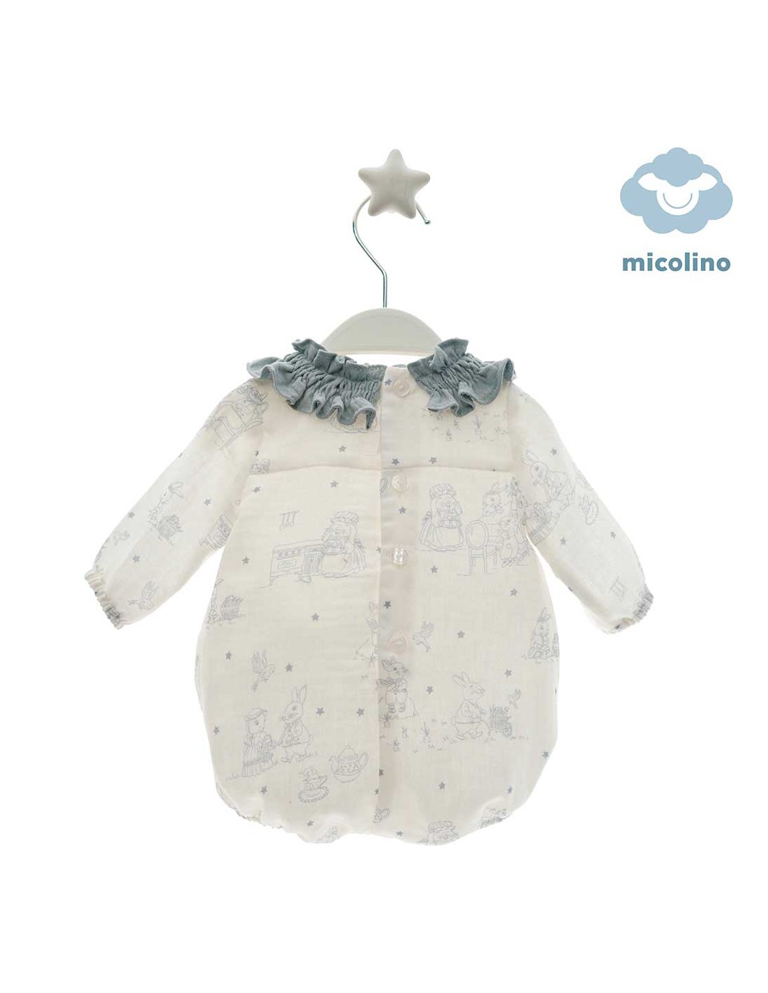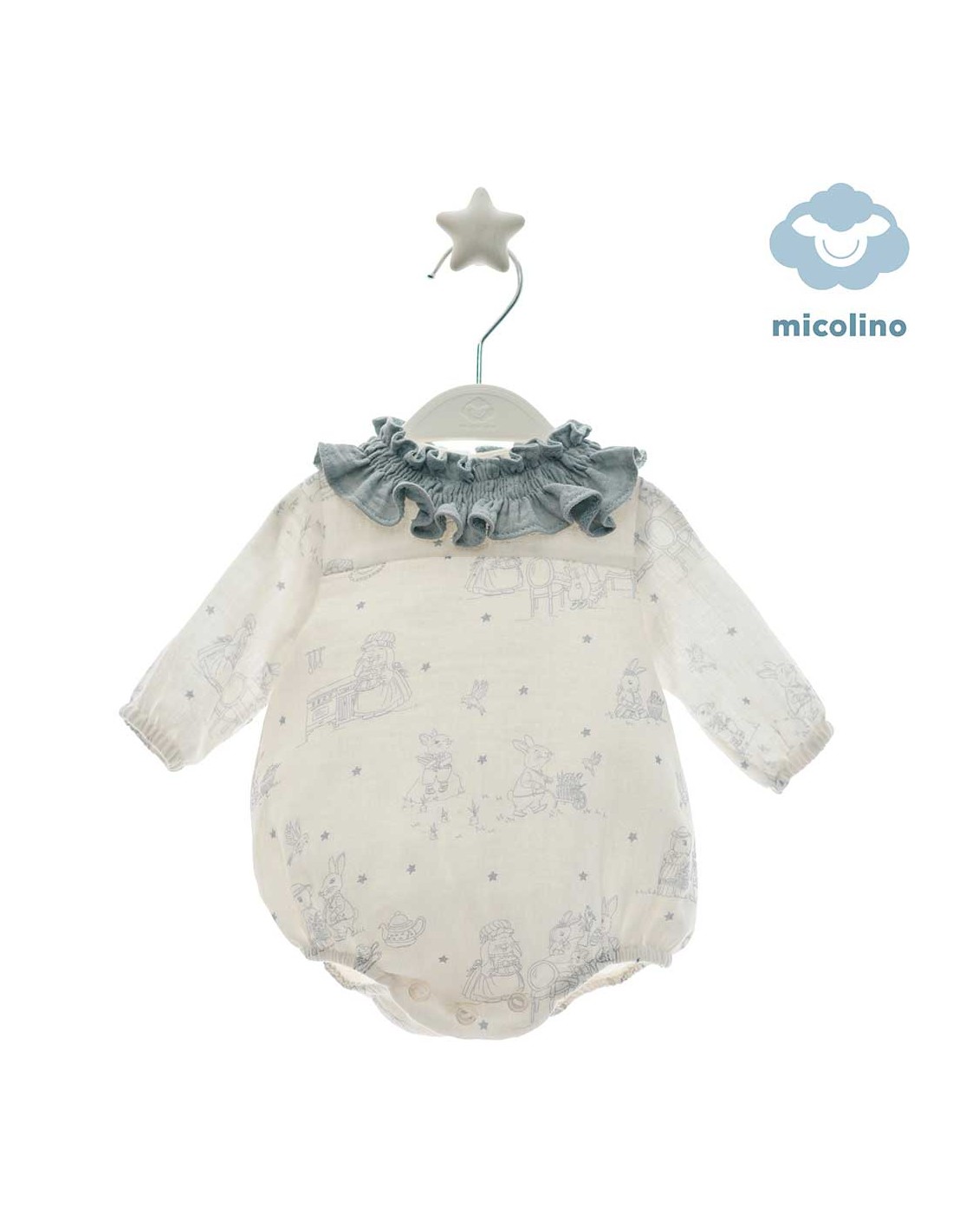 Diseño exclusivo de Micolino, con elegante cuello volante en tono azul grisáceo y estampado de dulces animalitos en tonos suaves.