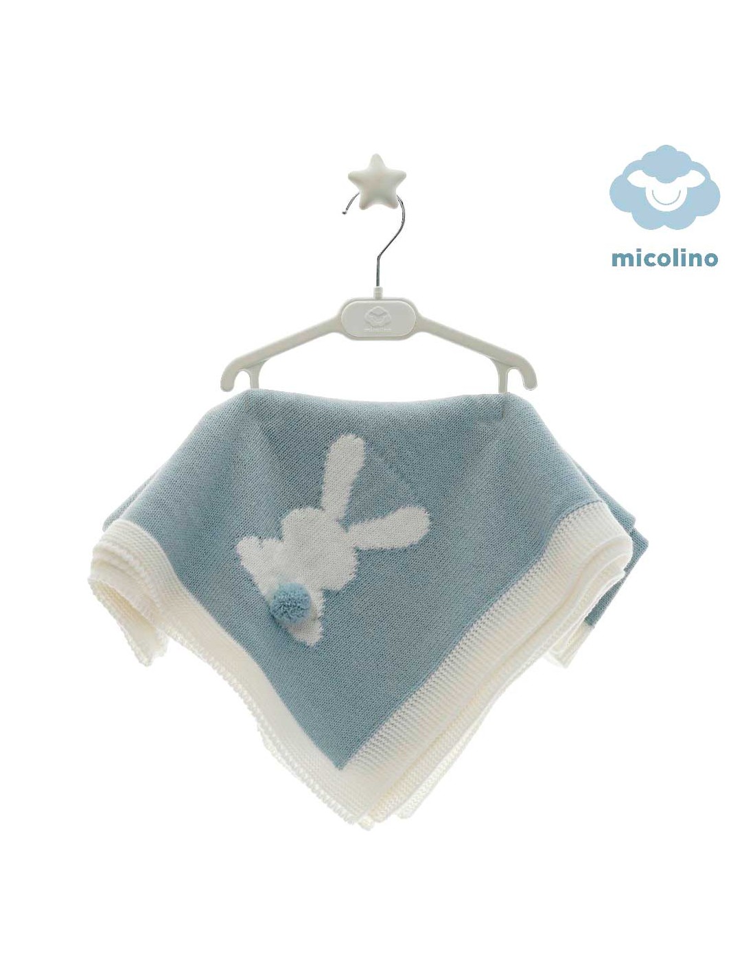 Confeccionada en punto de lana de gran calidad, en color azul con ribete crudo y decorada con un dulce conejito de espaldas y pompón, esta manta es perfecta tanto para niño como para niña.