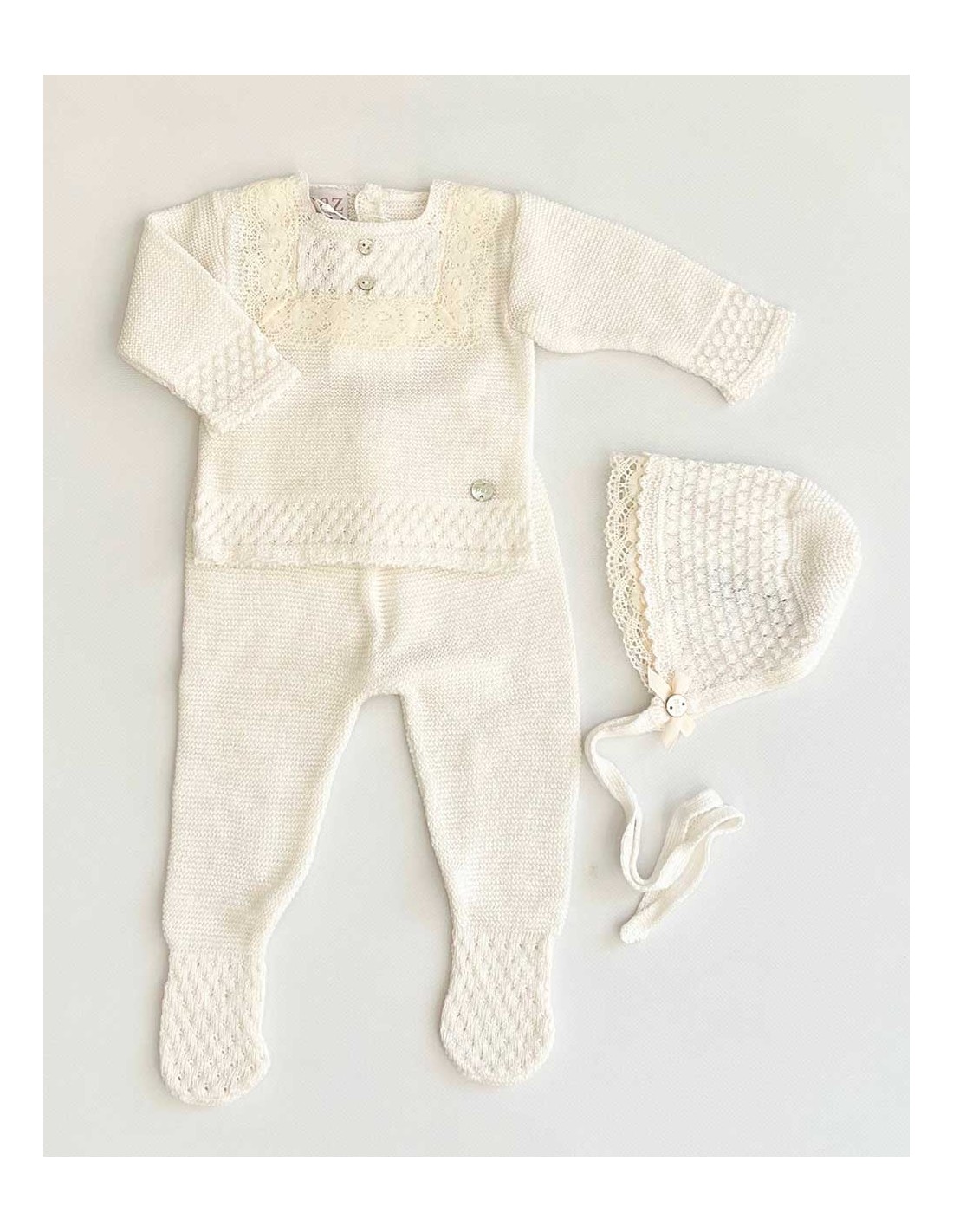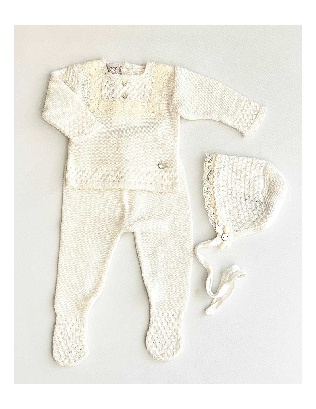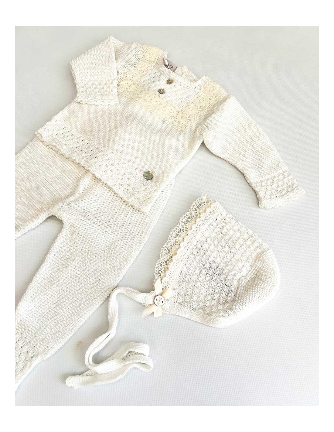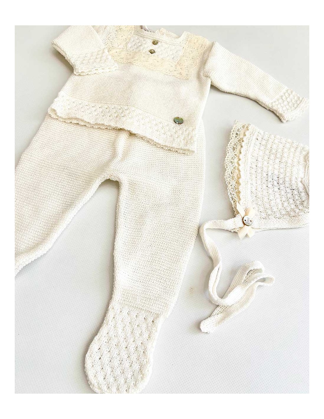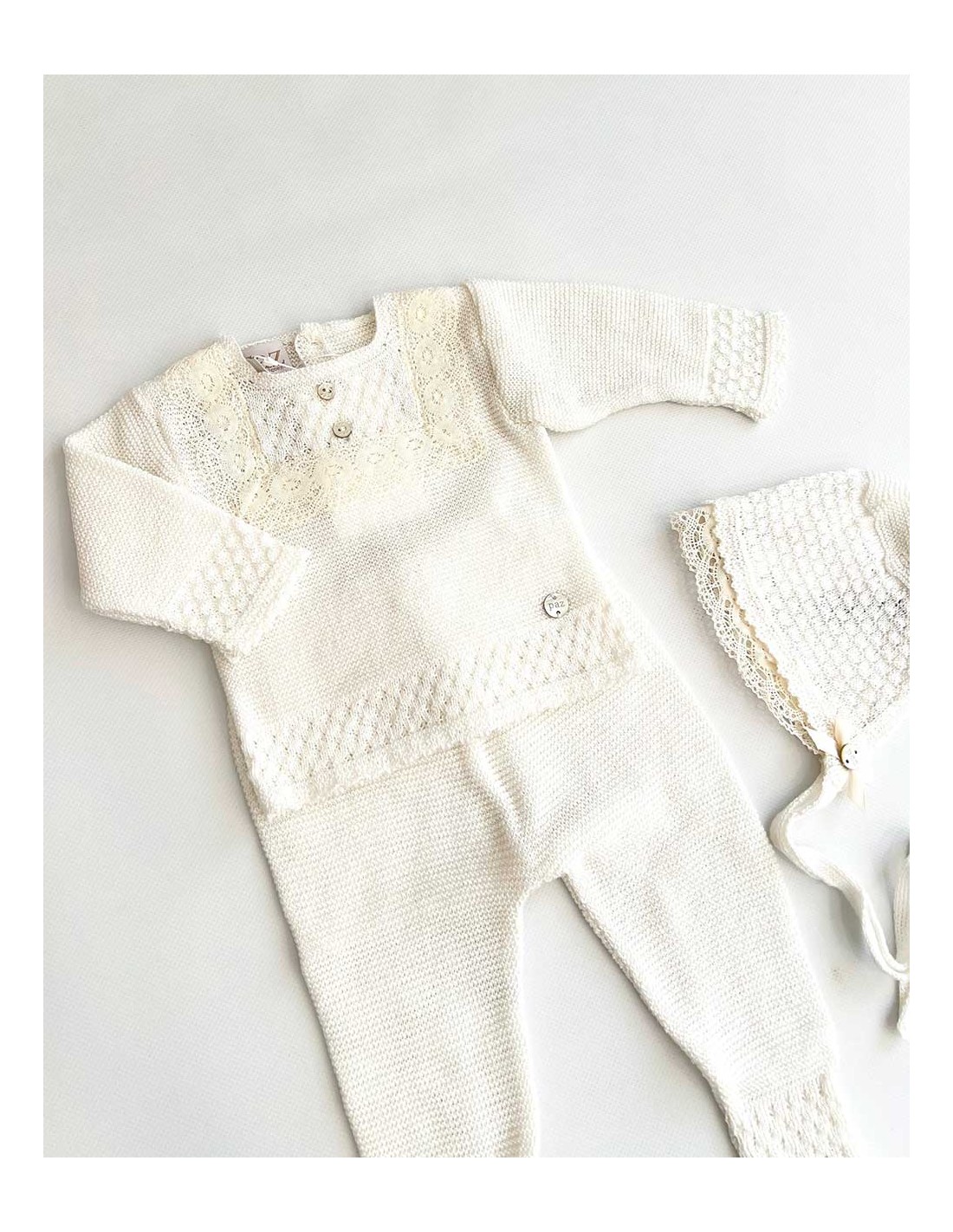 Está compuesto por jersey, polaina y capota a juego, todos en tono crudo con delicados detalles calados y encaje en el canesú, puños y borde de la capota.
