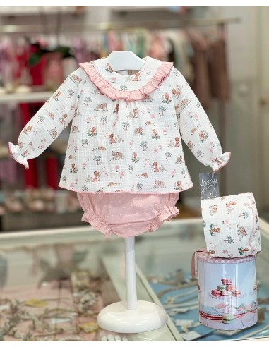 Confeccionado en muselina blanca con un delicado estampado de animalitos, se acompaña de braguita y capota a juego.