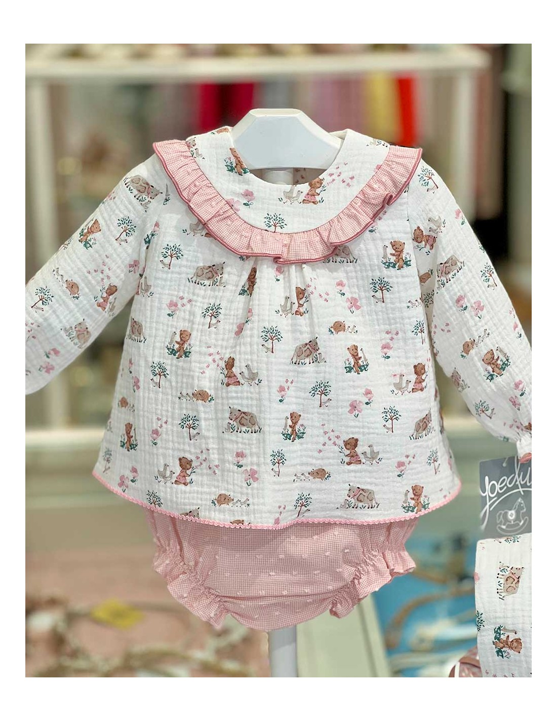 Confeccionado en tejido suave con un encantador estampado de animalitos, incluye vestidito, braguita de cuadros vichy rosa y capota a juego.